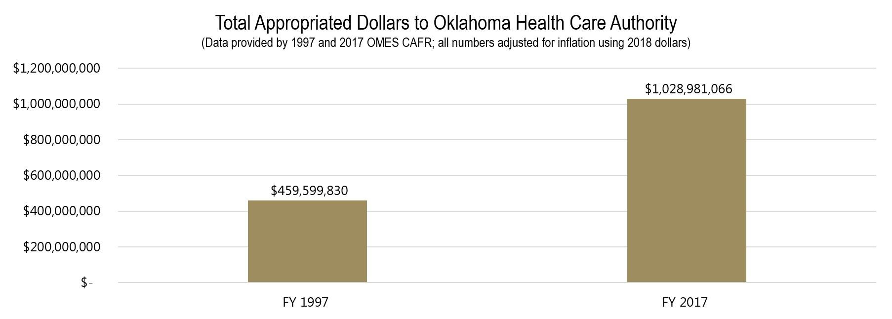 In 2017, the Oklahoma Legislature appropriated a total of $6.88 billion. The Oklahoma Health Care Authority (OHCA), which administers SoonerCare, received $1.029 billion, or 15 percent of those appropriated dollars. That's compared to the $460 million, or 7 percent of all appropriated dollars, OHCA received in 1997.