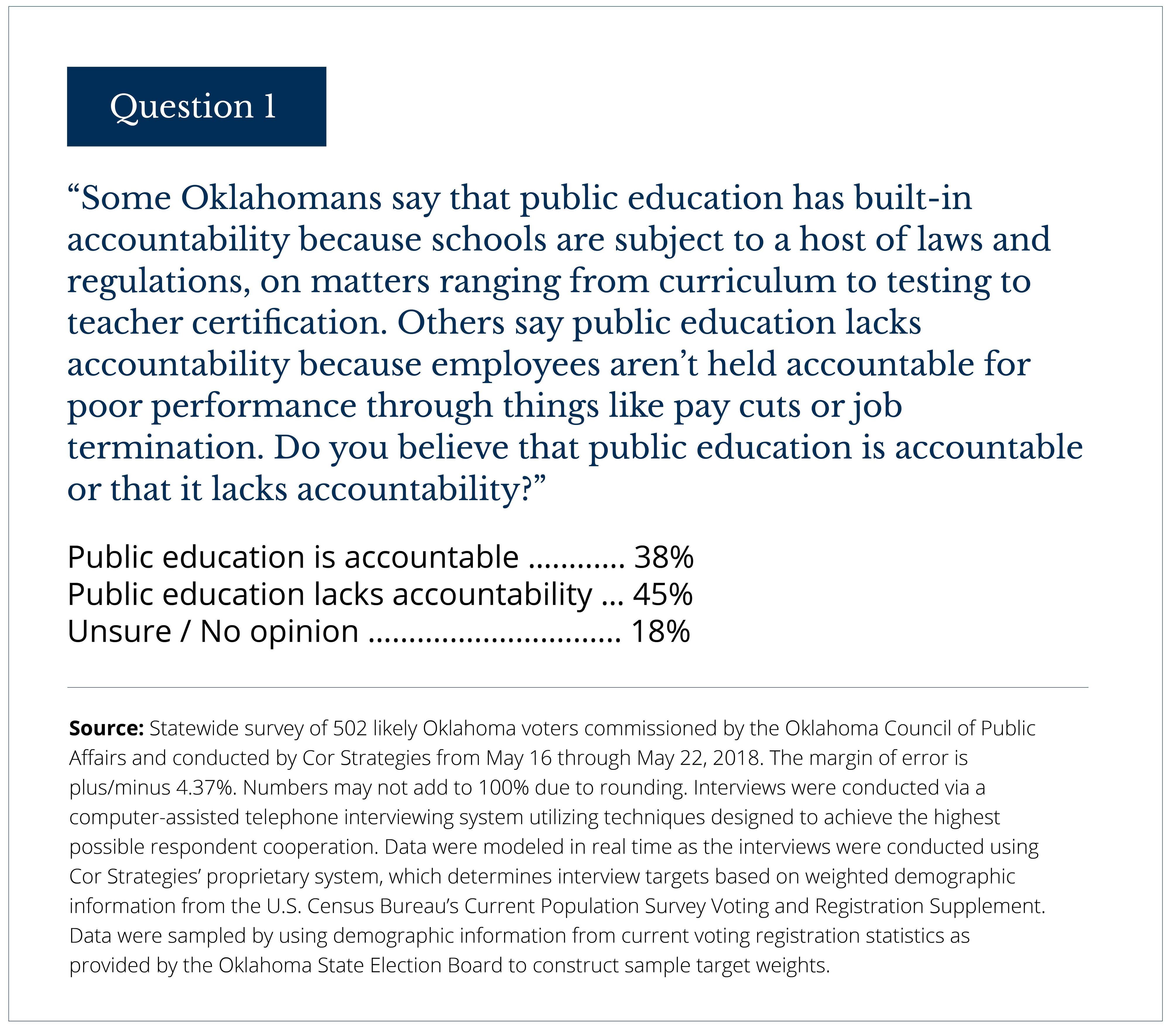 According to a new statewide survey of 502 likely Oklahoma voters commissioned by OCPA and conducted by Cor Strategies (margin of error: plus/minus 4.37 percent), Oklahomans are split on the question of whether public schools are accountable. By a narrow margin, a plurality believes that public schools lack accountability.