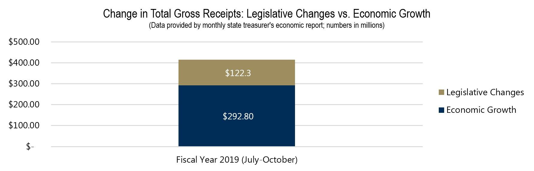 The Oklahoma State Treasurer released the monthly report for October revenue collections. Total Gross Receipts collected in October were $1,138.5 million—up 16.1 percent, or $158.3 million, from the same month last year. This sets a record for collections in the month of October. Fiscal year 2019 has been a year of records thus far, with each of the first four months setting record highs for monthly collections.