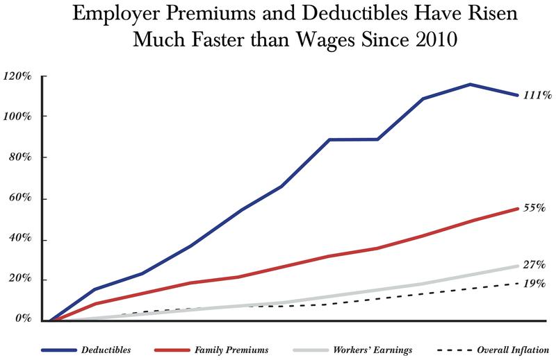 According to KFF, average family premiums have increased 55 percent over the last decade, while wages and inflation have increased only 27 percent and 19 percent, respectively.