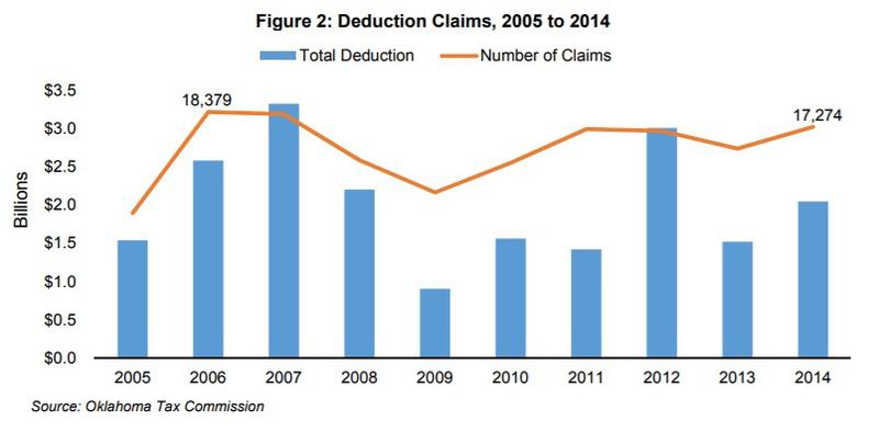 There has been no consistent trend of how much has been claimed through the deduction since its inception in 2005. Even the number of claims made is not a great indication of the actual amount deducted each year. (Note: the chart below is from the State of Oklahoma Incentive Evaluation Commission Capital Gains Deduction Evaluation; numbers are in nominal dollars.)