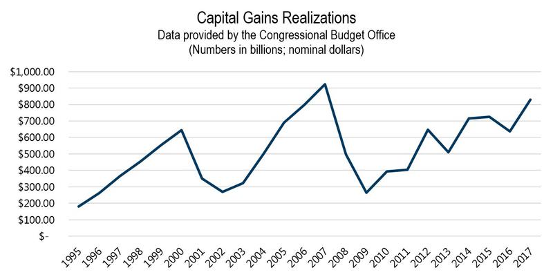 This follows the same trend, or lack thereof, with national data collected by the Congressional Budget Office on realized capital gains. As the chart shows, the same sort of variability in Oklahoma’s data can be seen in the national data as well.