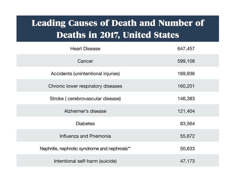 It is very true, in a graphic way, that the COVID-19 virus is having a serious and deadly impact on some of those infected. It is truly a very nasty virus with which we must contend. But the impact of this nasty disease needs to be examined and presented to the public in the greater context of all the other causes for morbidity and mortality in a modern society. The following is such a discussion. The table below presents the leading causes (and annual numbers) of death in the United States in 2017.