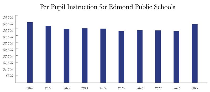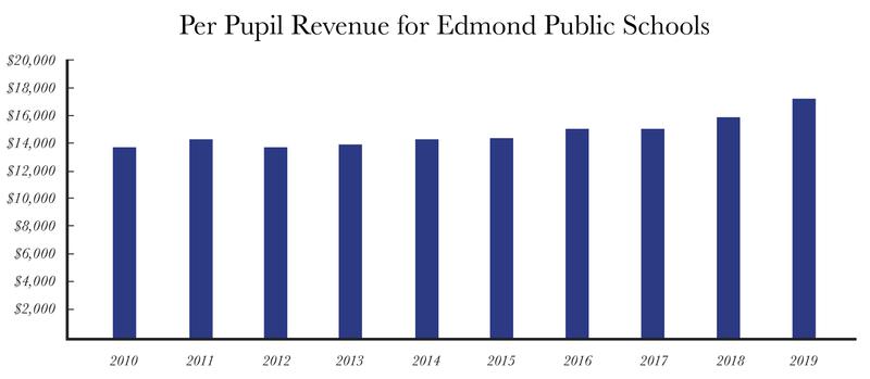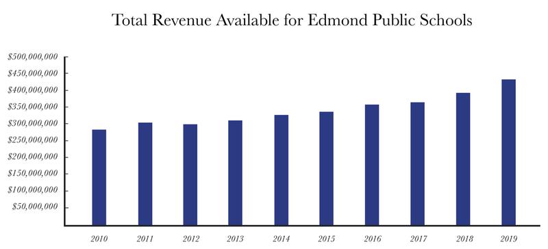 Edmond Public Schools (EPS) has seen a moderate increase in enrollment over the last decade but has experienced a faster increase in revenue. Since 2010, EPS has seen a 53 percent increase in total revenue available.