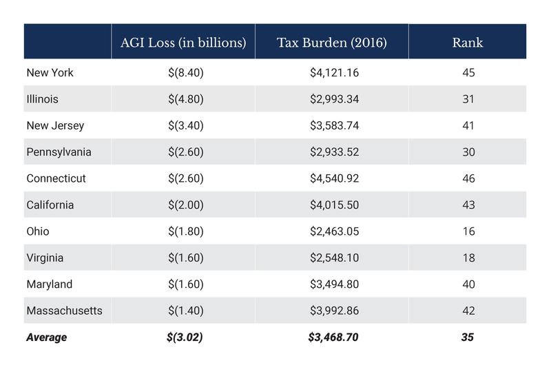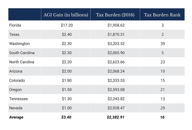 While the income tax rate may be a good indicator of a state’s potential for growth, a state’s overall tax burden is also an important metric to consider when assessing a state’s financial competitiveness. Again, looking at Bloomberg’s top 10 winners and losers in net AGI migration, states with a lower overall tax burden outgained those states with a higher tax burden.