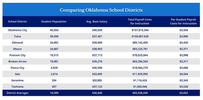 Teacher pay in Texas varied more by school district than in Oklahoma, based on the ten districts examined in each state. Average teacher salaries in the Texas districts ranged from $48,222 to $59,001. The range in Oklahoma districts was from $32,005 to $40,630. After the two teacher pay raises, these numbers should be approximately $39,325 to $47,950. Still, Texas pays teachers more. Spending data for these districts show that the Texas districts spent more than $1,200 more per student on instruction than the Oklahoma districts.