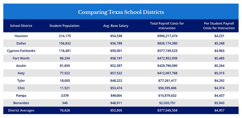 Salaries, however, are just one part of total compensation. The school districts provide other monetary benefits. Because the available data from Texas do not separate teachers from other instructional personnel, we have used total payroll costs for instruction, which include salary and other benefits, to compare between the different districts in each state.