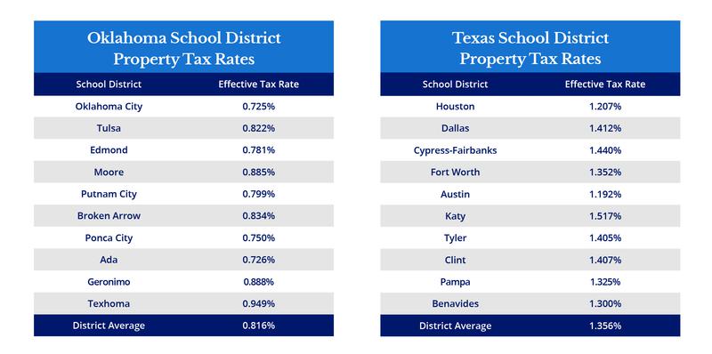 Oklahoma levies a much lower property tax than does Texas. While the rate is not uniform across either state, the Texas districts on average have an effective tax rate of 1.356 percent. These rates vary from 1.517 percent in Katy to 1.207 percent in Houston. The average effective tax rate for Oklahoma districts was .816 percent. These rates ranged from a high of .949 percent in Texhoma to a low of .725 percent for Oklahoma City.