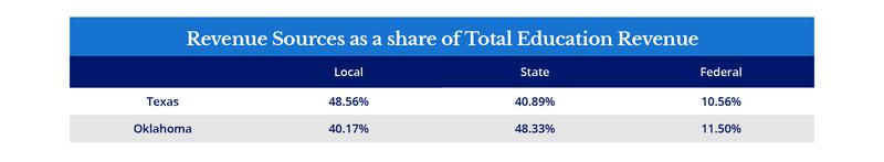 One of the major differences between Oklahoma and Texas is how the states fund education. State sources provide 48 percent of total revenue for education in Oklahoma. Texas relies more on local revenues, with 48 percent of Texas’ total education revenue coming from local sources. The breakdown between state, local, and federal revenue sources can be seen in the chart below.
