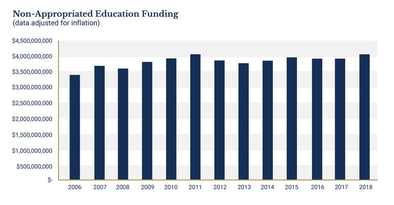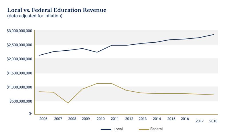 Non-appropriated revenue peaked in 2011 at $4.1 billion, primarily due to an influx of federal stimulus money which was meant to help states which were struggling through the recession. In 2011 federal revenue sources were $1.1 billion when adjusted for inflation, a 37 percent increase from 2006. Since then federal revenues have dropped to $694 million, a 38 percent decrease. As federal revenues have fallen since 2011, local funding has steadily increased. Between 2006 and 2018 local revenue sources have grown 36 percent from just over $2 billion to $2.85 billion.