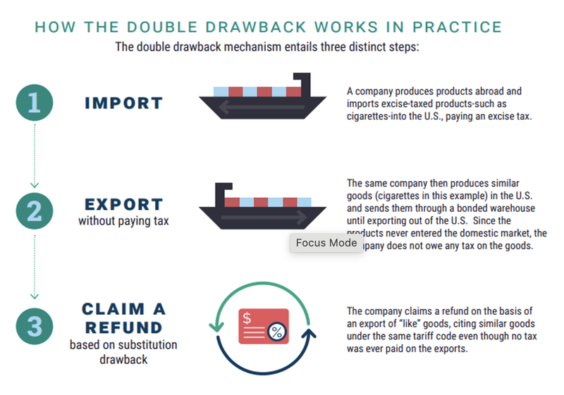 The way it works has two steps. First, a company imports foreign-made cigarettes and pays a $1.01 per pack excise tax when they enter the U.S. market (all good so far). Second, the same company manufactures another batch of cigarettes in the U.S. and exports them via a bonded warehouse, which allows for exportation without paying an excise tax (still fine, as excise taxes should only be paid on domestically consumed products). But then, finally, the double drawback loophole allows companies to claim a $1.01 excise tax “refund” on their exported merchandise, even though those exports never paid an excise tax.