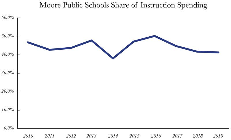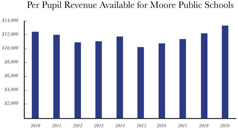 During that same period, total revenue for MPS grew by 21 percent. Thus, per-pupil revenue has grown by almost 7 percent since 2010, from $12,465 to $13,303. That revenue would result in $332,575 for a classroom of 25 students. The average salary for a Moore public school teacher is $57,191.