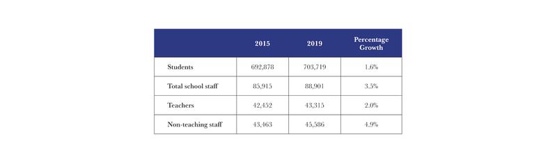 The most recent data (2019) show that the trend has continued. Since 2015 teachers as a percentage of total staff has fallen from 49.4 percent to 48.7 percent in Oklahoma. The chart below shows the change in non-teaching staff compared to the growth in students and teachers.