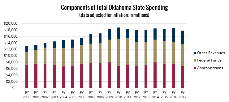 Appropriations is what the Legislature is authorized to spend from the general revenue fund. This comes from multiple revenue sources and totaled $6.8 billion in FY 2017. Total state spending is all spending from all funds that the state of Oklahoma spends each year; that number totaled $17.8 billion in FY 2017.