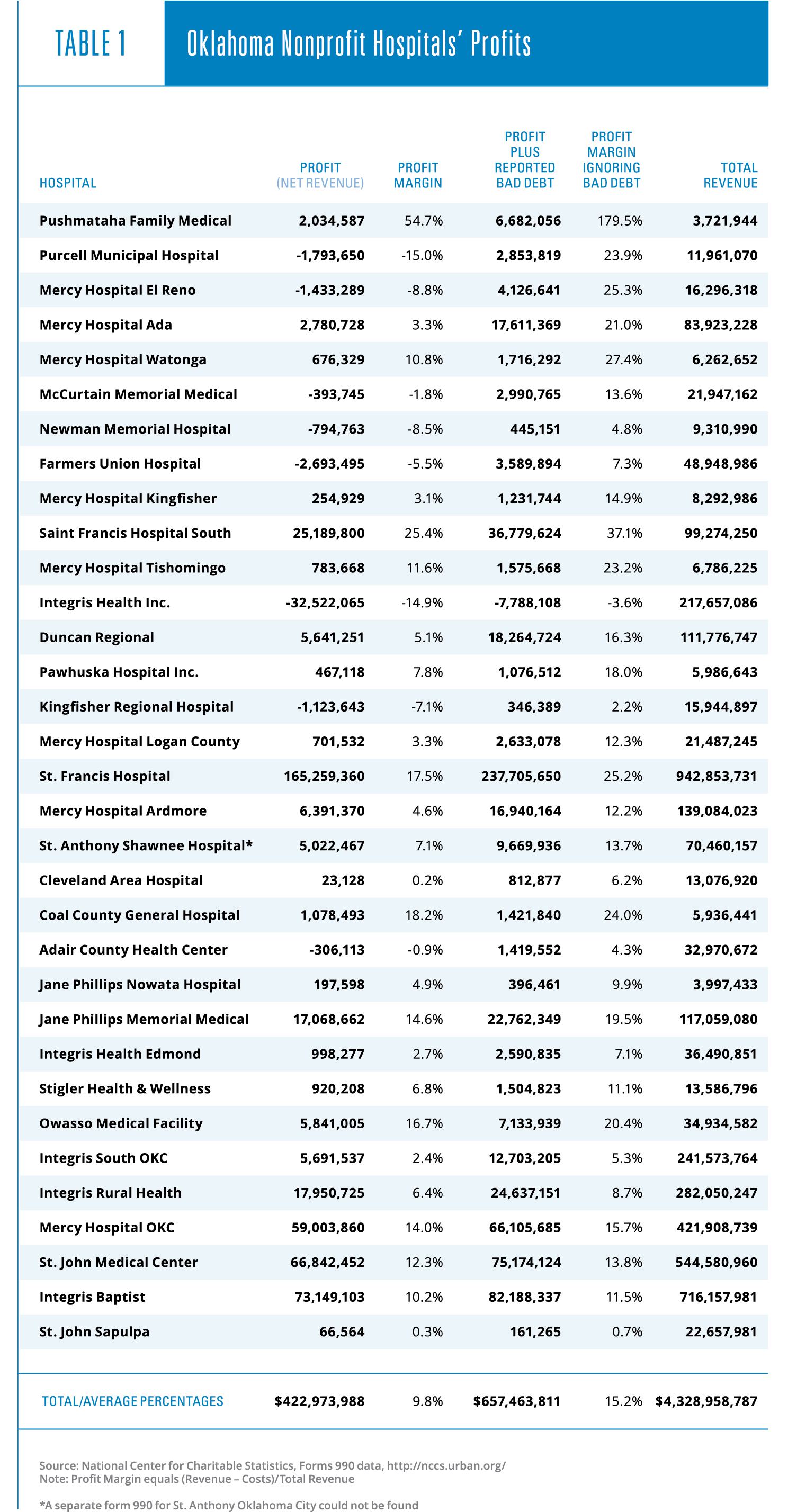 Large profits for nonprofit hospitals exist despite massive amounts claimed as bad debt. According to Steven Brill, “$39.3 billion in charity care cost the hospitals less than $3 billion to provide. That’s less than half of 1% of U.S. hospitals’ annual revenue and includes bad debt that the hospitals did not give away willingly in any event.” Because of this, it is helpful to look at nonprofits’ profit margins, both for profits calculated without subtracting bad debt and profits reported as net revenue, which does account for bad debt. These amounts for 32 nonprofit hospitals in Oklahoma can be found in Table 1.