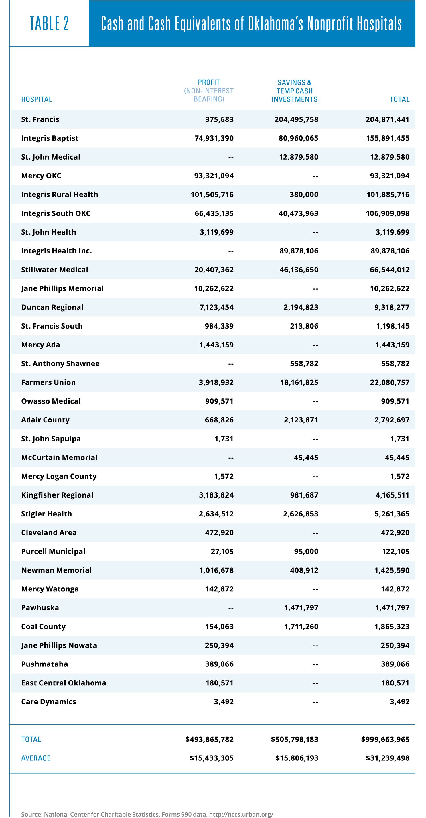 Moreover, with their sizable profit margins, nonprofit hospitals in Oklahoma are able to maintain large cash and cash-equivalent balances. These amounts show up on IRS reports as either cash, savings and temporary investments, or both. These are shown in Table 2. The 32 nonprofit hospitals reporting such balances have a total of a billion dollars of liquid funds, an average of more than $31 million per hospital. These are not amounts one would expect to see if nonprofit hospitals in Oklahoma were under financial distress.