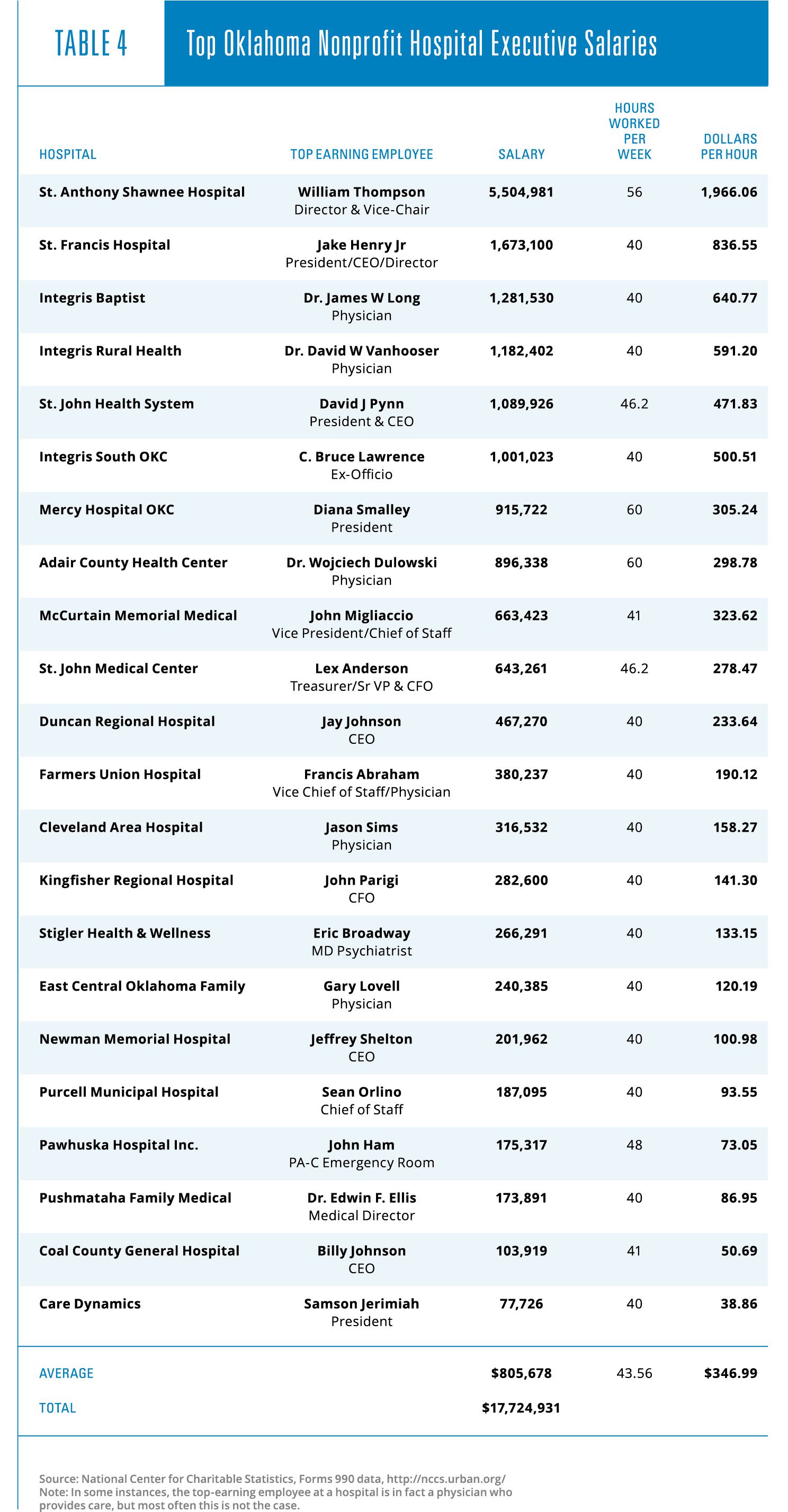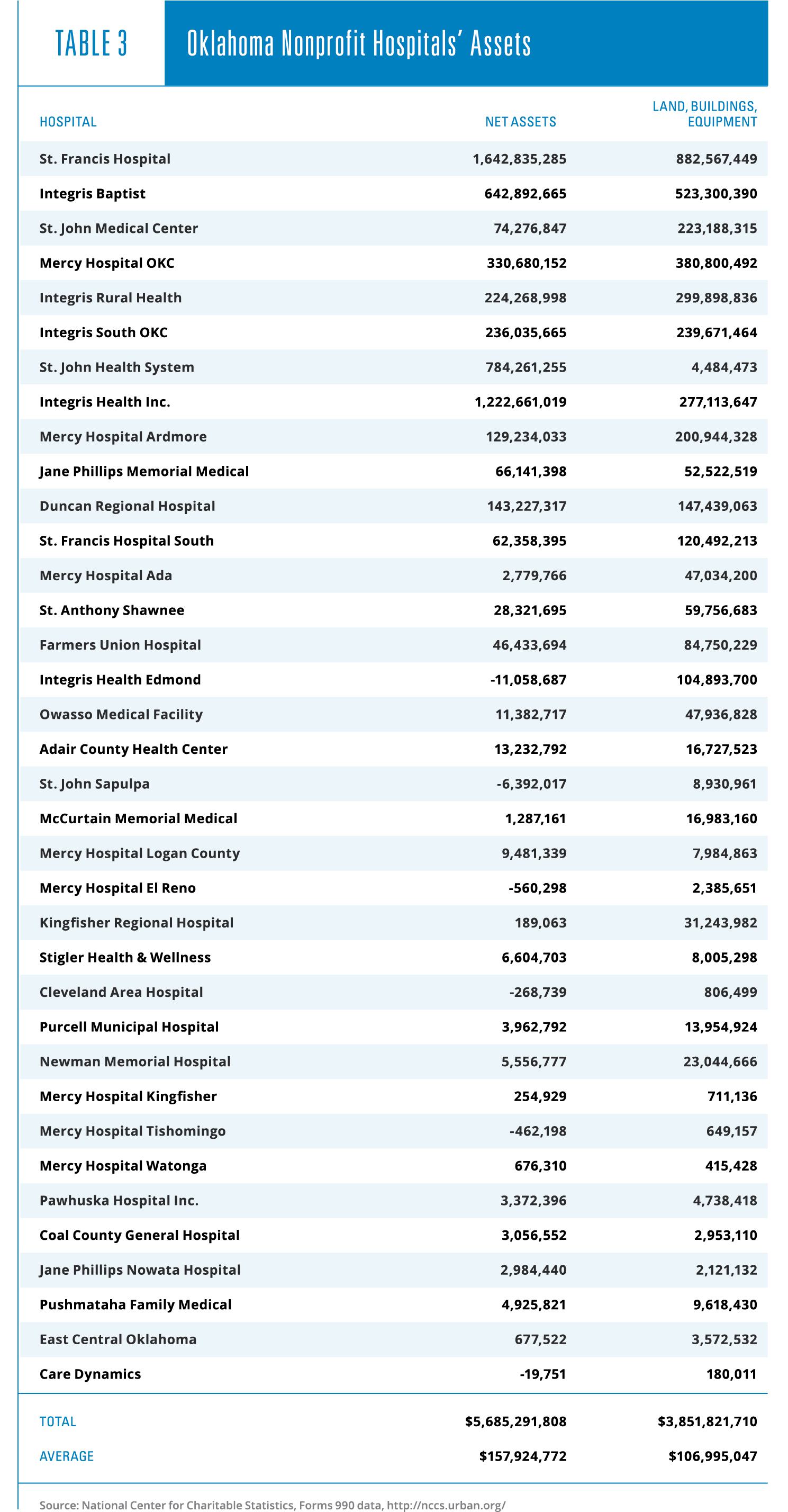 Cash does not constitute all the assets of hospitals. Most of their assets are in fixed investments, including buildings and equipment. Spending generously on these assets, as it happens, helps to reduce the appearance of profitability. As can be seen in Table 3, total net assets of the 36 Oklahoma nonprofits included in this study amount to more than $5.6 billion, an average of $158 million per hospital.