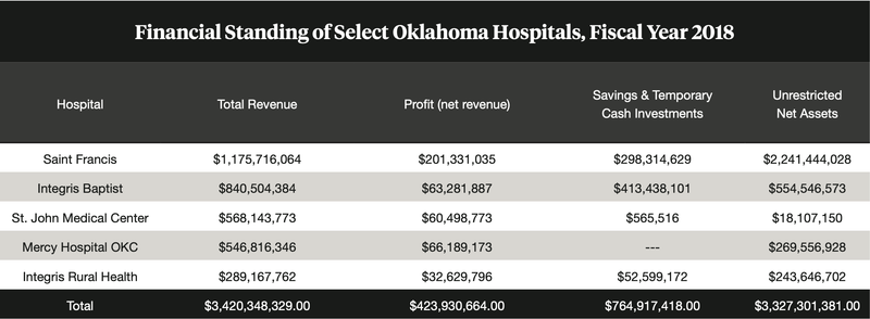 As shown in the nearby table, according to their latest federal filings, Oklahoma’s five largest hospitals generated $3.4 billion in revenue and pocketed $423 million in profit. They hold $764 million in cash and temporary cash investments, with unrestricted net assets totaling $3.3 billion.