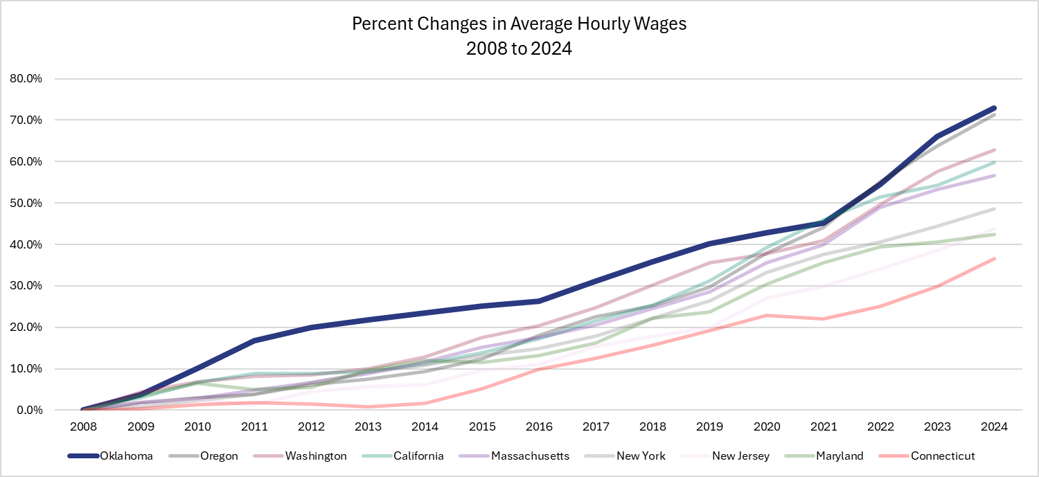 Oklahoma’s average hourly wage grew faster than in any of the states that adopted a $15 minimum wage.