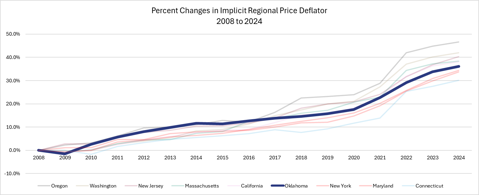 The other three states were New York, Maryland, and Connecticut, which were three of the five most expensive states in the country in 2008; Oklahoma was 42nd. By 2024, seven of the eight states with a $15-an-hour minimum wage were in the top 10 most expensive states. Oregon sits at 11th but had the greatest increase in prices of any state in the country since 2008.