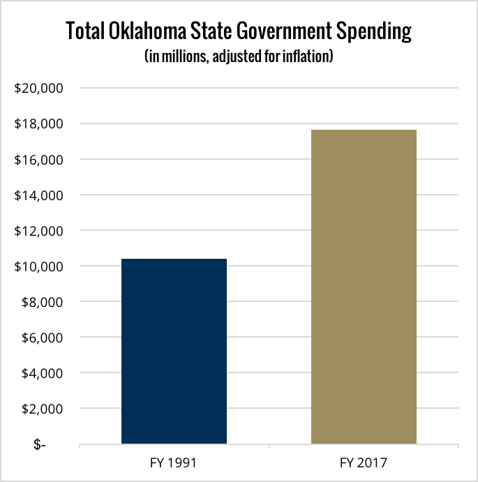 In one generation, total state spending in Oklahoma has increased by $7.2 billion even when adjusted for inflation. This 70% increase shows the size and scope of government growing at an unsustainable rate. Over the same period, Oklahoma’s population grew by just 24%.