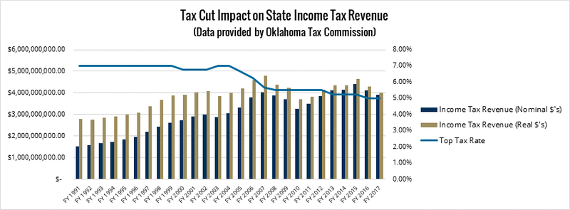 Most of these tax cuts occurred while Gov. Brad Henry was in office. In Fiscal Year 2003, the top income tax rate was 7%. By Fiscal Year 2008, the rate had been cut to 5.5%. This was just before the great recession began to dampen state revenues. During those six years, as the tax rate fell from 7% to 5.5%, revenues grew by $526 million when adjusted for inflation.