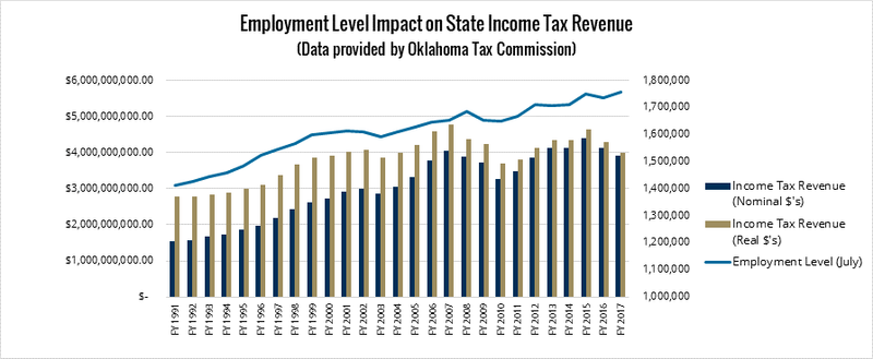 Data from the Oklahoma Tax Commission show that income tax revenue has grown from $1.54 billion in 1991 to $3.93 billion in 2017 despite cuts to the top marginal income tax rate over the same period of time, from 7% in 1991 to 5% in 2017. Even when adjusted for inflation, revenue has grown by 43% from 1991 to 2017. This growth in revenue correlates with the rise in employment in Oklahoma. As the graphs below show, employment has a much greater impact on income tax revenue. And, what seems surprising is that income tax rates have been found to have a negative correlation with revenue collections.