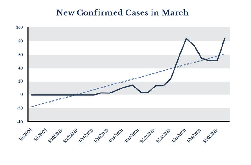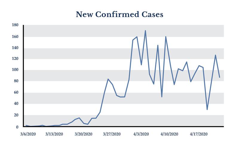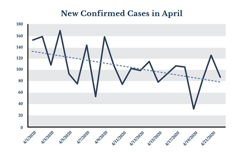 As the virus began to grow throughout March new cases per day steadily climbed. But so far in April, the number of new cases has been trending downward as the second graph shows.