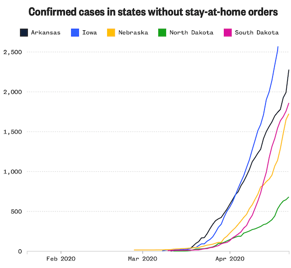 NBC News posted a dishonest story (‘In some rural states with no lockdown orders, cases on the rise’) about the five states that never imposed shutdowns. It included this graph: