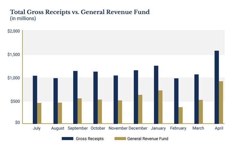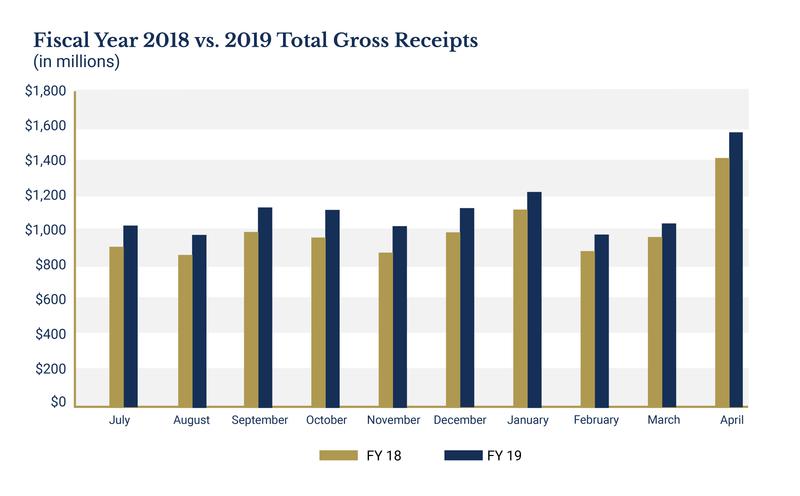 The Office of the State Treasurer, in conjunction with the Oklahoma Office of Management and Enterprise Services (OMES), last week released the monthly report for April 2019 revenue collections. Total gross receipts collected in April 2019 were $1.58 billion—an increase of 12.7 percent, or $178 million, from the same month in the prior year. The General Revenue Fund (GRF) grew 25.5 percent from the same month the previous year, collecting $509 million.