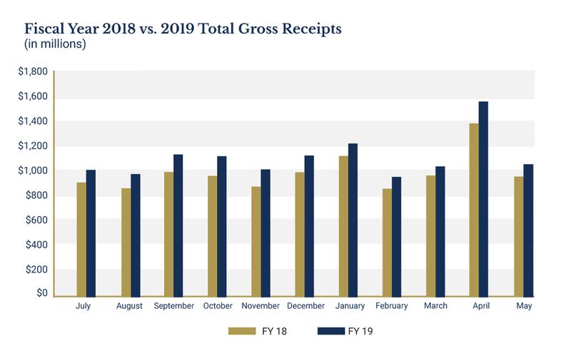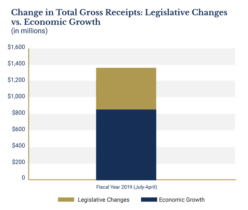 New revenue from House Bill 1010xx amounted to $58.4 million, or 57 percent, of the total growth for the month. Legislative changes have now amounted to $507 million or 38 percent of total revenue growth for fiscal year 2019.