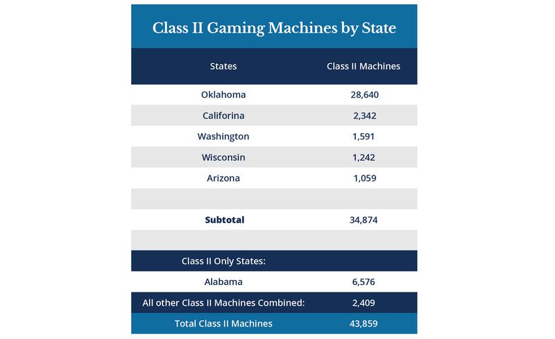 Class II machine count numbers in Oklahoma are self-reported by tribes to a few industry consultants each year. In an August 24, 2016 article for Global Gaming Business Magazine, Dave Palermo talked with industry sources to get nationwide class II machine counts. The article summarized Class II numbers as follows:
