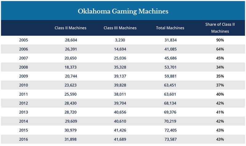 For 2016, Meister calculated that Oklahoma had 31,898 class II bingo slots and 41,689 class III slots for a total of 73,587 total machines.