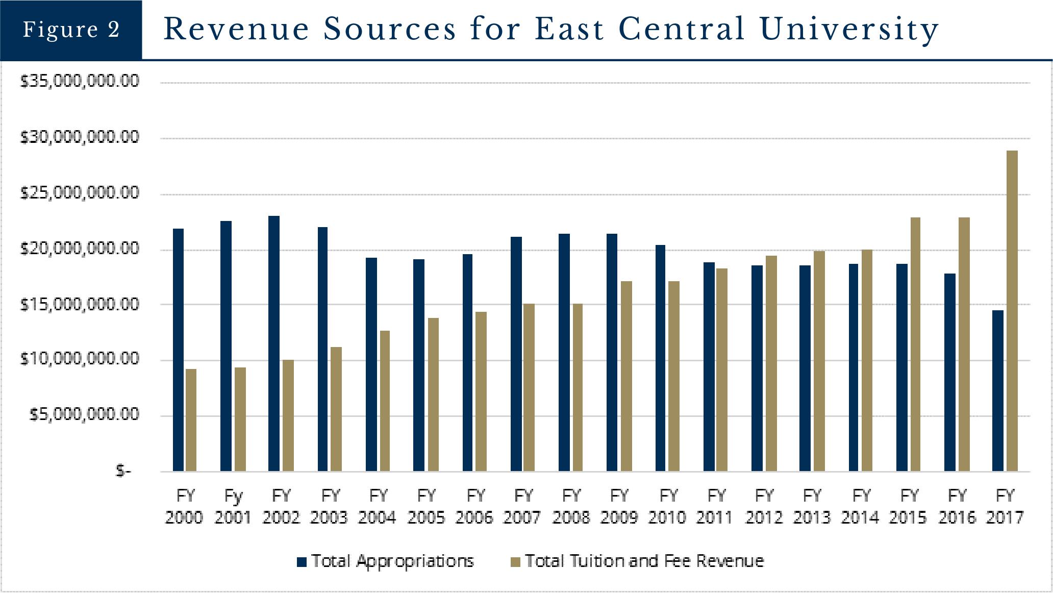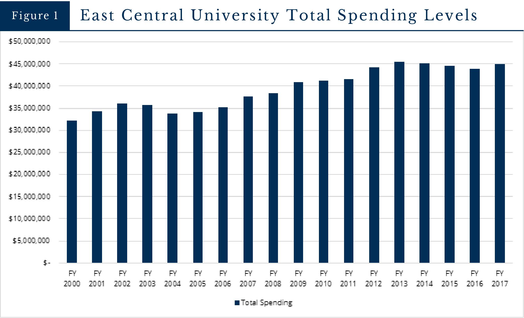 As higher education spending goes up, more and more of the cost is pushed to students and their families. OCPA has assembled data for all Oklahoma state institutions of higher education—find it here. Below is information on East Central University. The first chart, below, shows total spending.