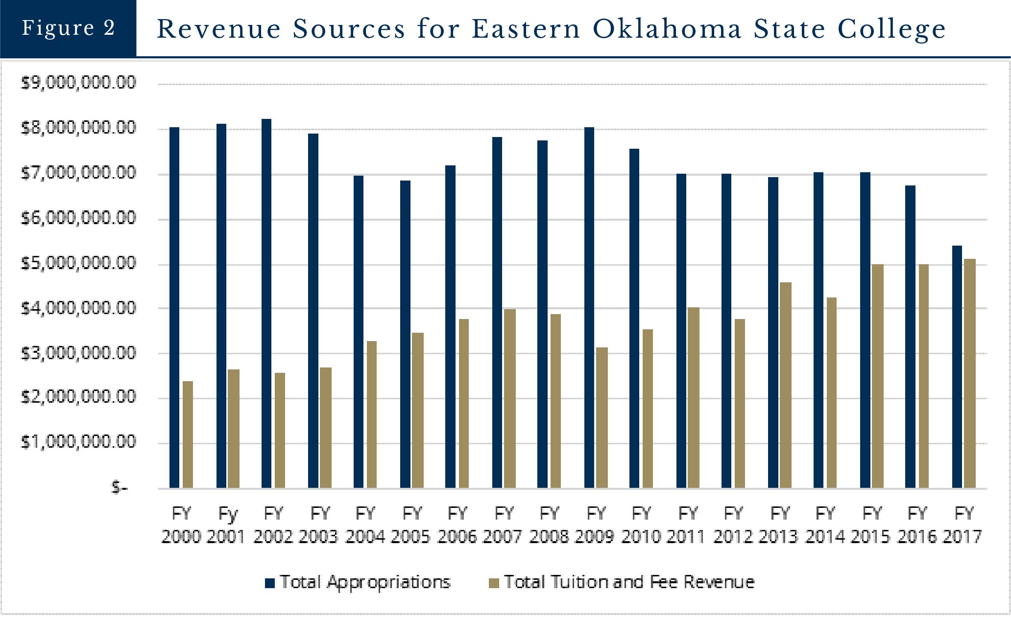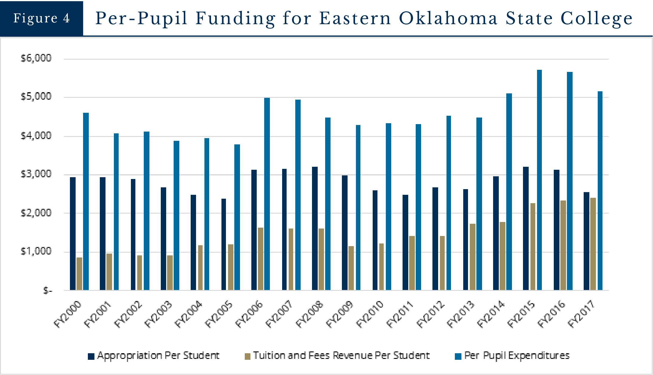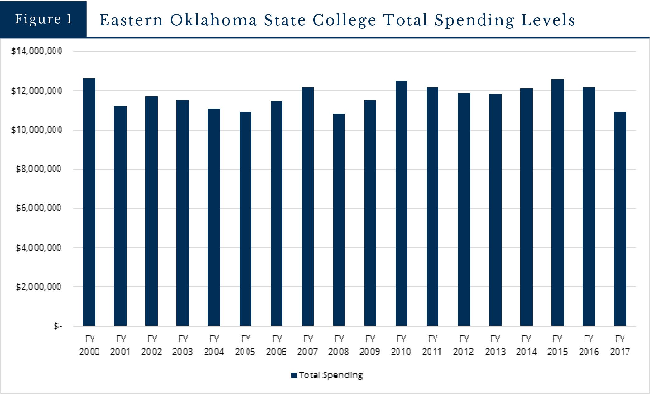 As higher education spending goes up, more and more of the cost is pushed to students and their families. OCPA has assembled data for all Oklahoma state institutions of higher education—find it here. Below is information on Eastern Oklahoma State College. The first chart, below, shows total spending.