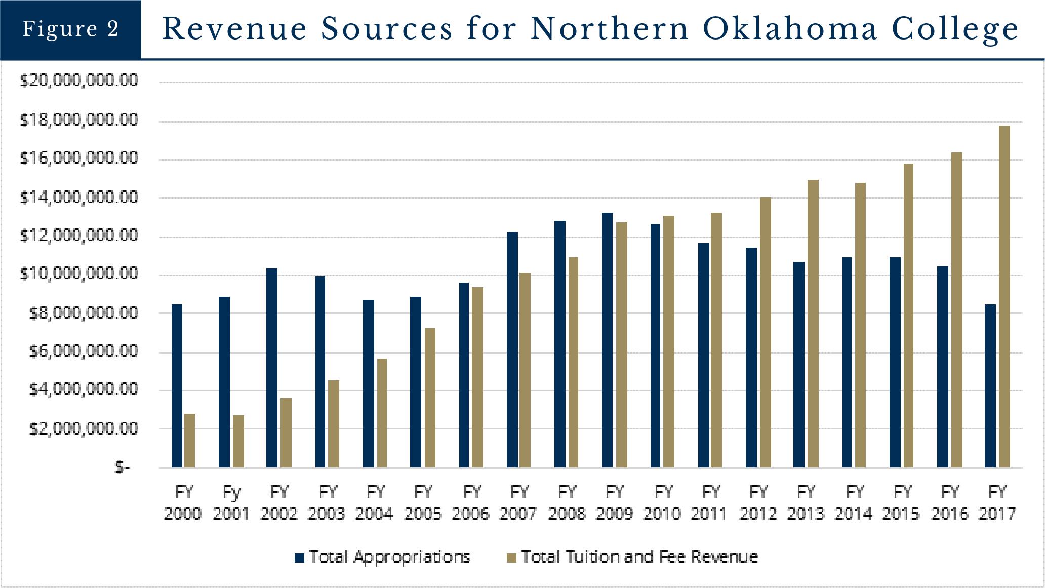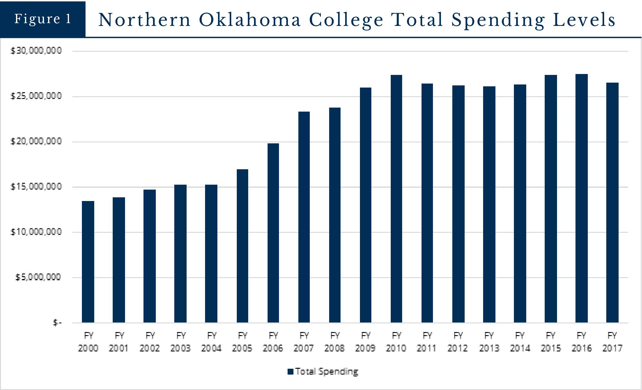As higher education spending goes up, more and more of the cost is pushed to students and their families. OCPA has assembled data for all Oklahoma state institutions of higher education—find it here. Below is information on Northern Oklahoma College. The first chart, below, shows total spending.