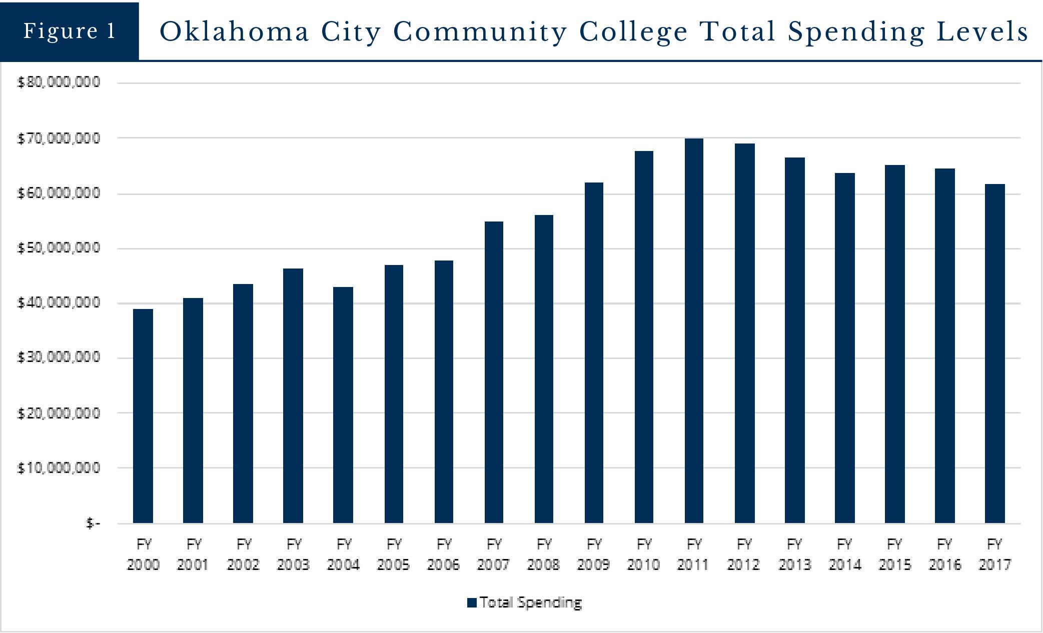 As higher education spending goes up, more and more of the cost is pushed to students and their families. OCPA has assembled data for all Oklahoma state institutions of higher education—find it here. Below is information on Oklahoma City Community College. The first chart, below, shows total spending.