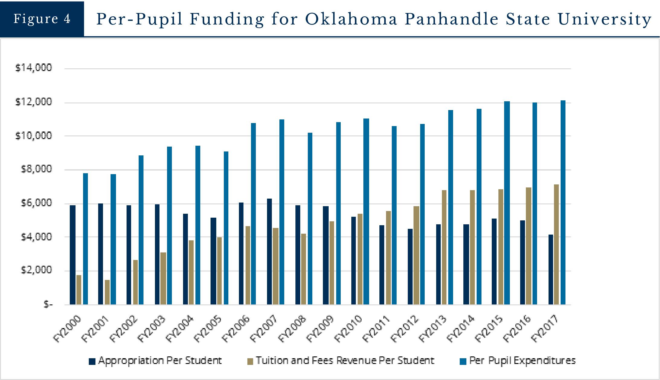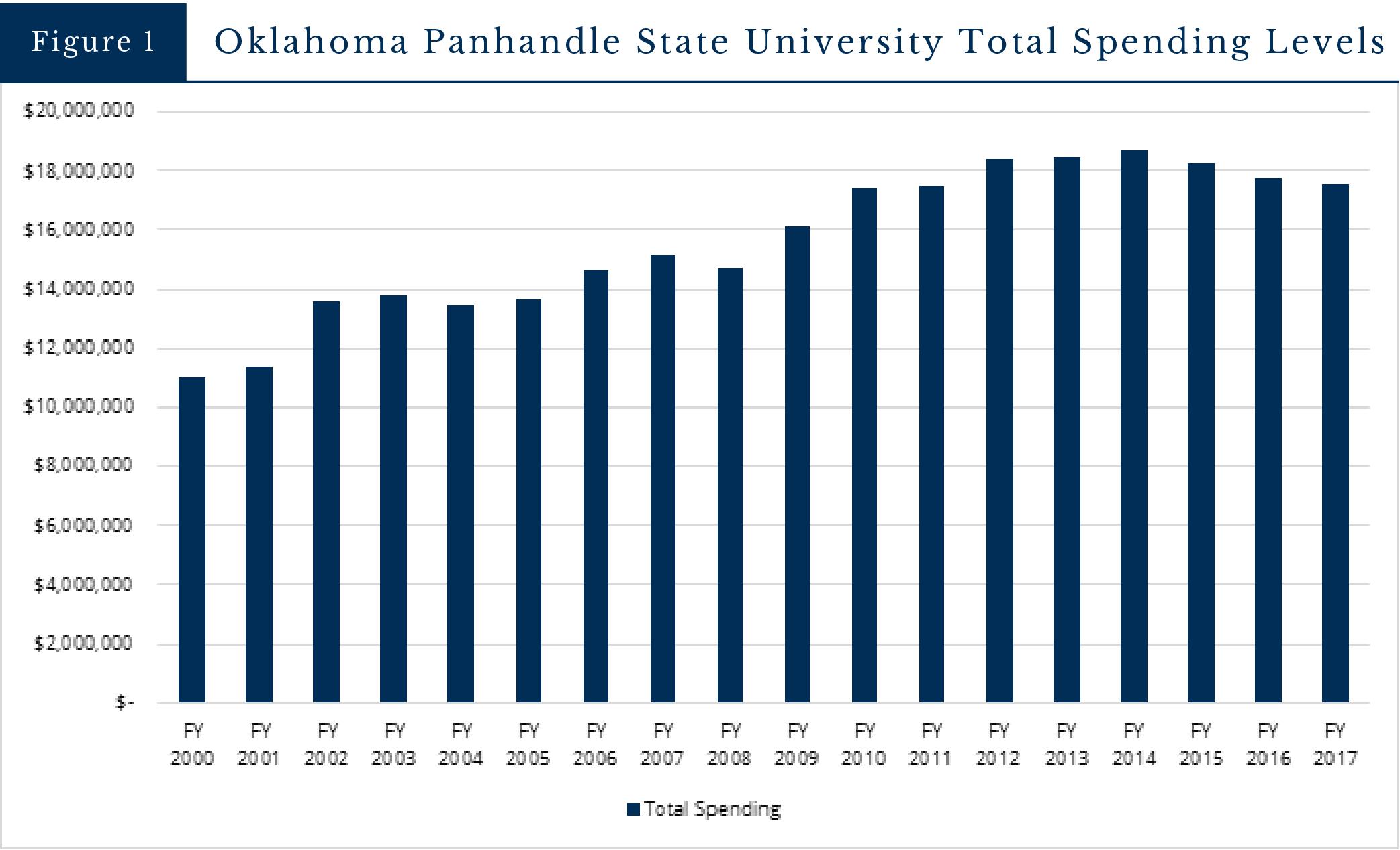 As higher education spending goes up, more and more of the cost is pushed to students and their families. OCPA has assembled data for all Oklahoma state institutions of higher education—find it here. Below is information on Oklahoma Panhandle State University. The first chart, below, shows total spending.