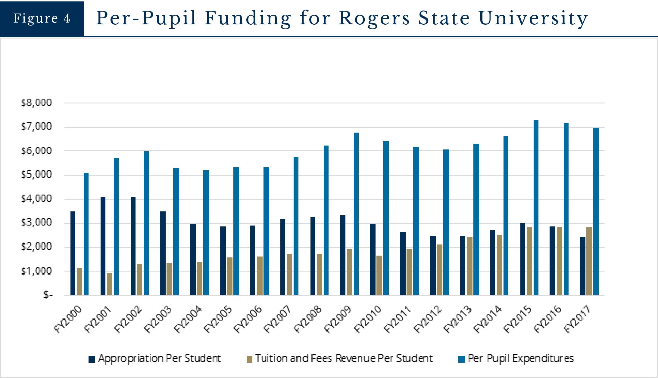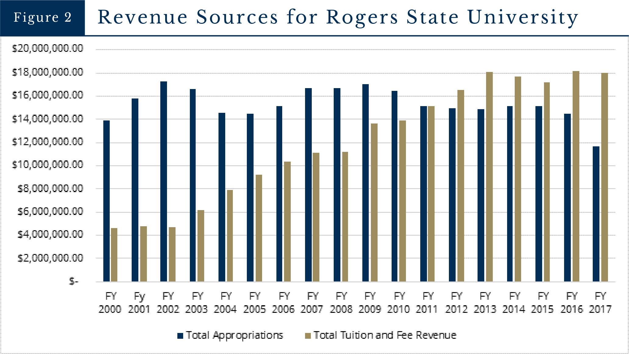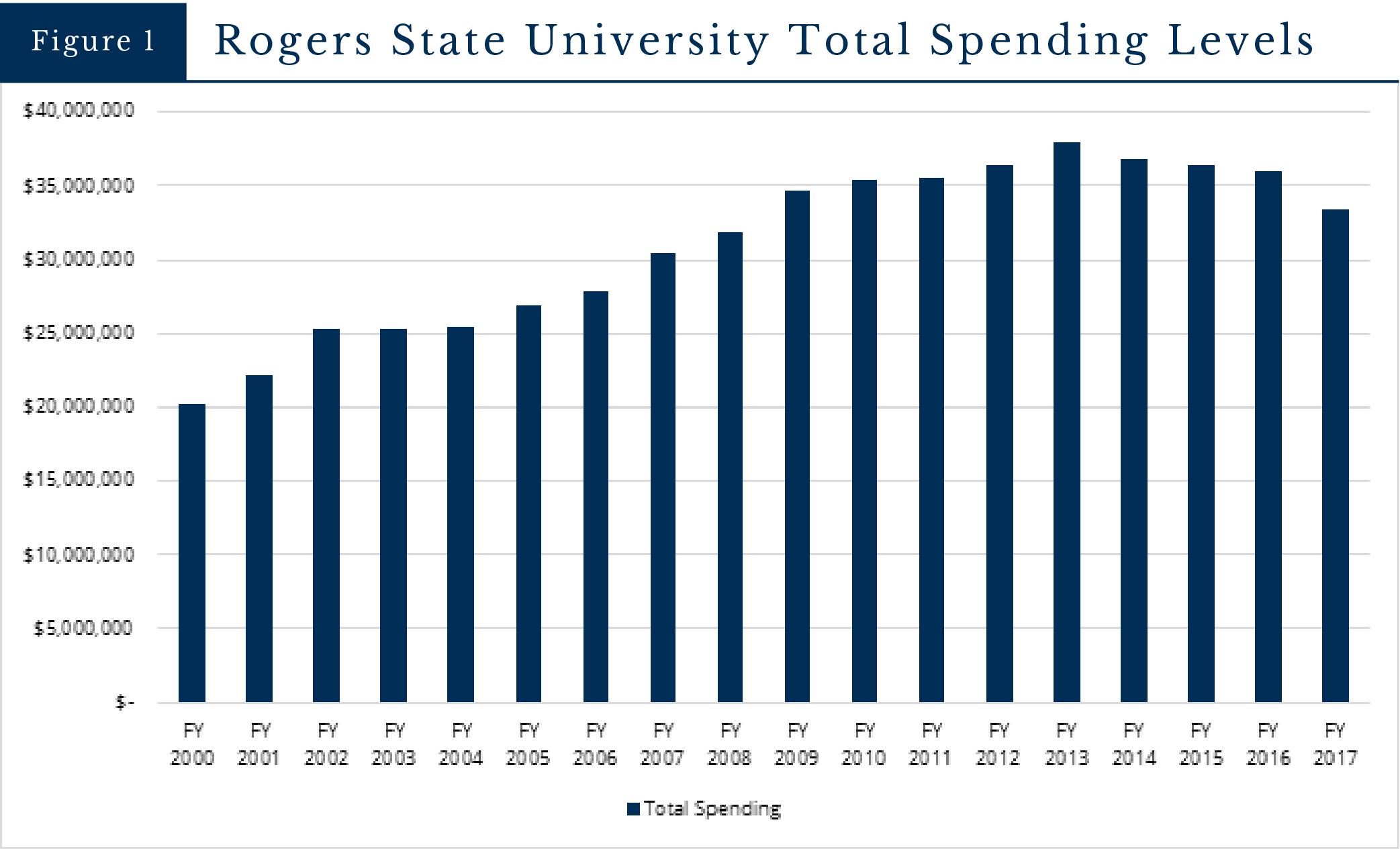 As higher education spending goes up, more and more of the cost is pushed to students and their families. OCPA has assembled data for all Oklahoma state institutions of higher education—find it here. Below is information on Rogers State University. The first chart, below, shows total spending.