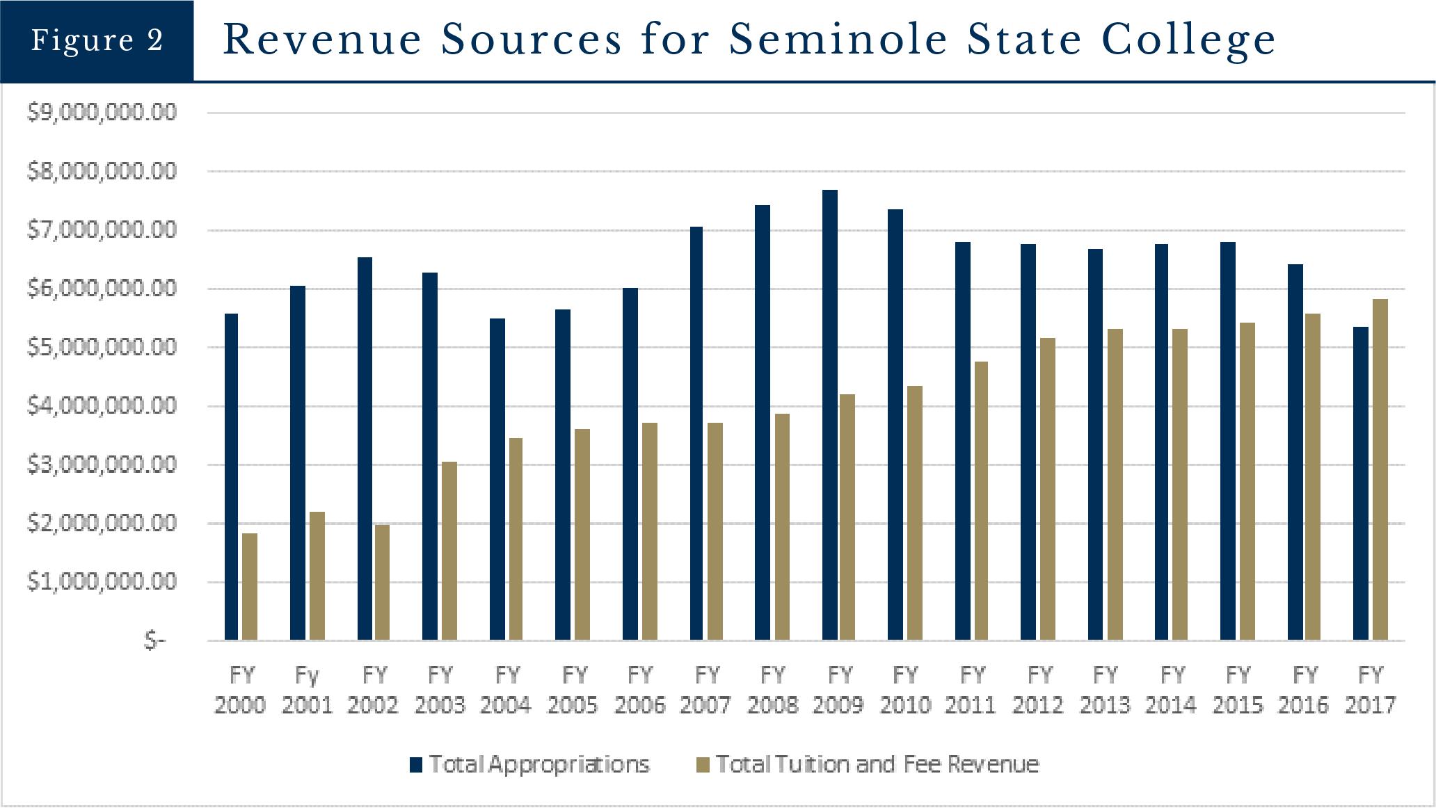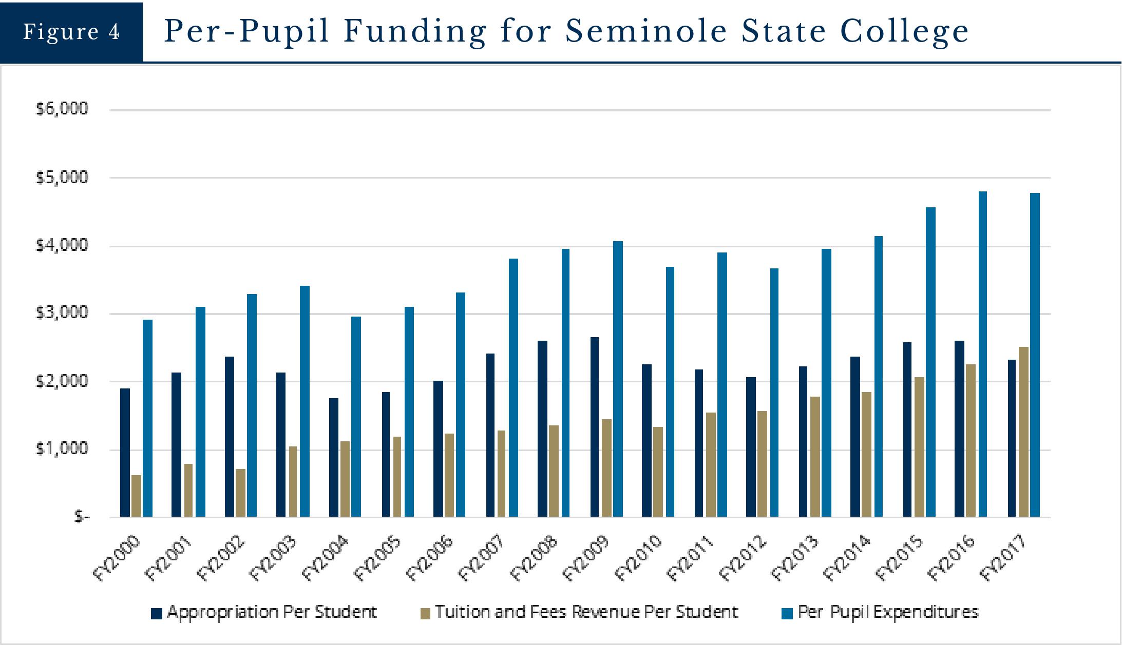 As higher education spending goes up, more and more of the cost is pushed to students and their families. OCPA has assembled data for all Oklahoma state institutions of higher education—find it here. Below is information on Seminole State College. The first chart, below, shows total spending.