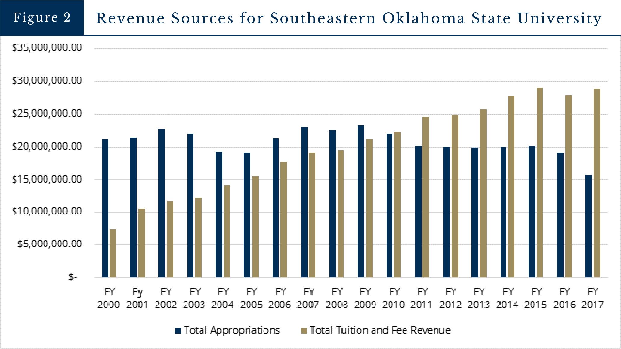 As higher education spending goes up, more and more of the cost is pushed to students and their families. OCPA has assembled data for all Oklahoma state institutions of higher education—find it here. Below is information on Southeastern Oklahoma State University. The first chart, below, shows total spending.