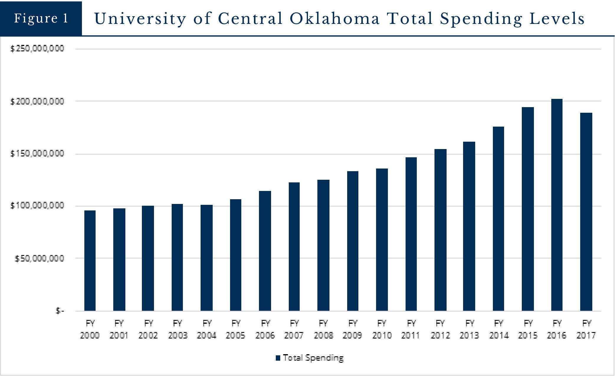 As higher education spending goes up, more and more of the cost is pushed to students and their families. OCPA has assembled data for all Oklahoma state institutions of higher education—find it here. Below is information on the University of Central Oklahoma. The first chart, below, shows total spending.
