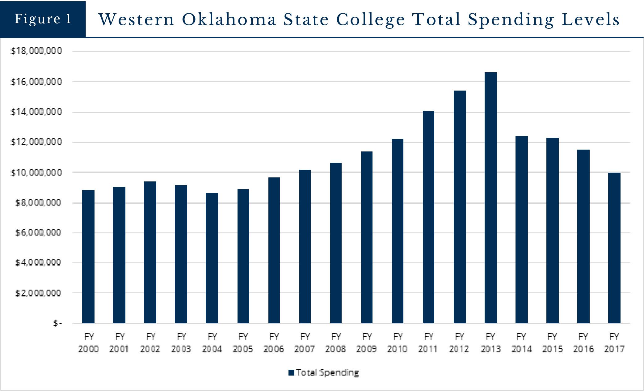 As higher education spending goes up, more and more of the cost is pushed to students and their families. OCPA has assembled data for all Oklahoma state institutions of higher education—find it here. Below is information on Western Oklahoma State College. The first chart, below, shows total spending.