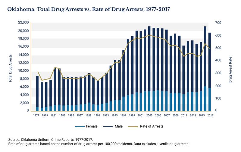 Oklahoma’s drug arrest rate and total number of drug arrests have increased considerably over the past 40 years, hitting their peak in 2003 as shown by the chart below.