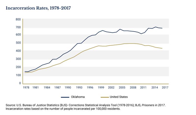 Since 1980, Oklahoma’s incarceration rate has risen dramatically, as shown by the chart below. The United States’ incarceration rate has declined since 2008.
