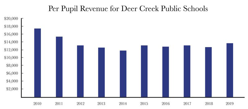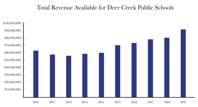 During the last decade the student count for Deer Creek public schools has nearly doubled. Per-pupil revenue in 2019 was nearly $14,000 (nearly $350,000 for a classroom of 25 students).