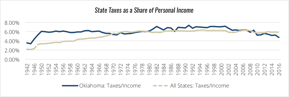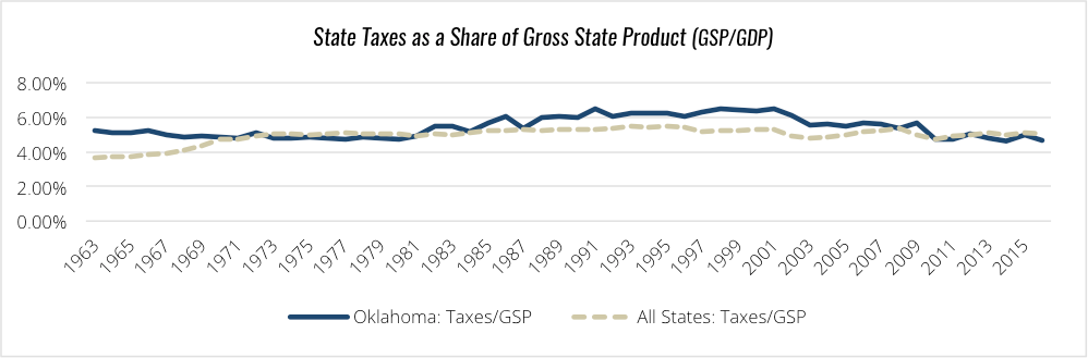 Freeland’s research looks back to 1942 when comparing taxes as a share of state income and finds that for 68 out of those 88 years Oklahoma had a higher tax burden then the national average. When comparing GSP from 1963 forward, a similar trend is found. Oklahoma had higher taxes as a share of GSP for 40 out of the 53 years that were analyzed. During the 1990s both indexes show Oklahoma above the national average, but in more recent years Oklahoma has begun to trend downwards. Oklahoma has been under the average in both indices since 2010.