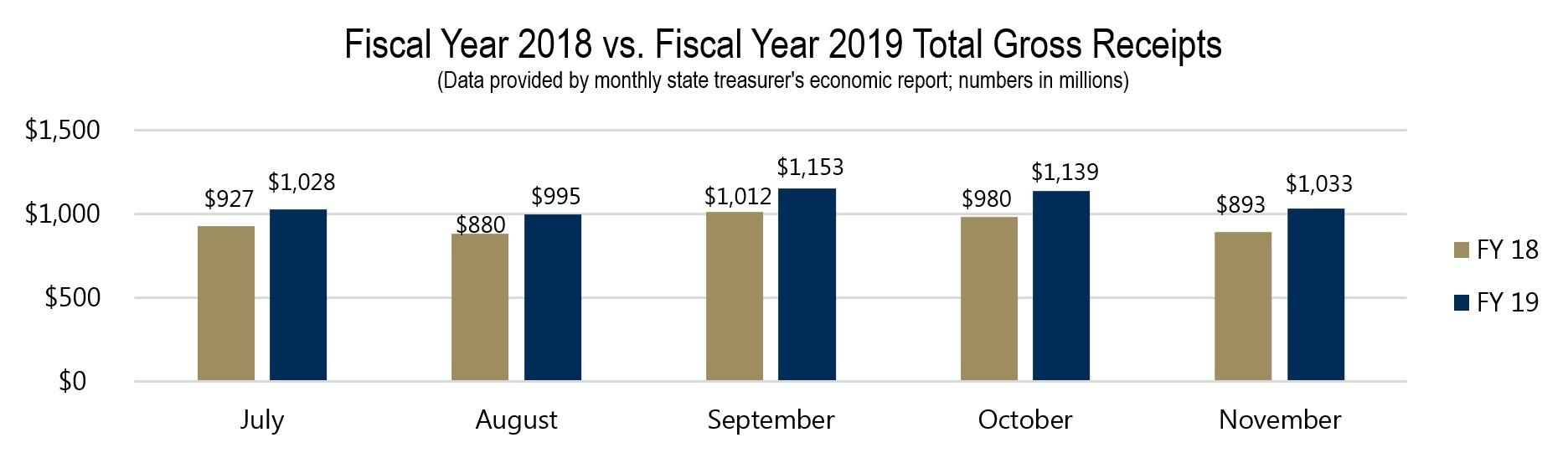 Total Gross Receipts collected in November 2018 were $1.03 billion—an increase of 15.7 percent, or $140 million, from the same month in the prior year. Record highs have now been set during each of the four months of this fiscal year. The General Revenue Fund (GRF) grew 28.6 percent from the previous year, coming in at $502 million.