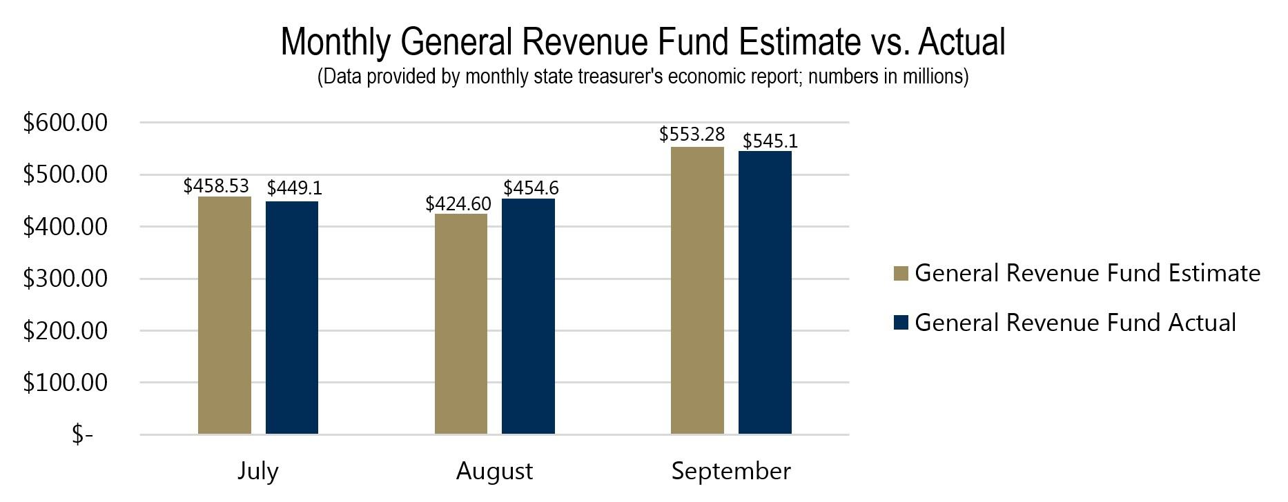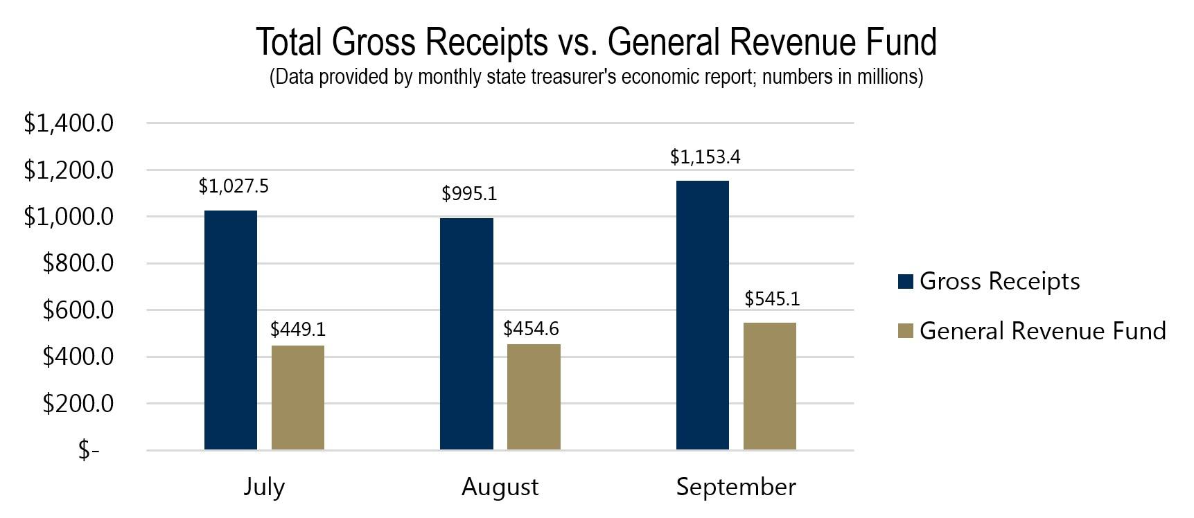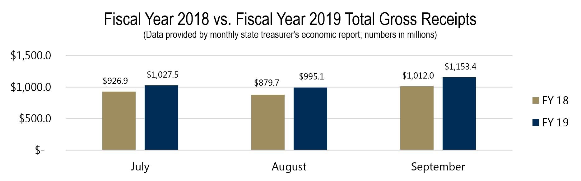 Total Gross Receipts collected in September 2018 set a record high of $1.15 billion—an increase of 14.1%, or $141.4 million, from the same month in the prior year. Record high revenue collections have now been set during the first three months of this fiscal year. The General Revenue Fund (GRF) grew 7.9% from the previous year, coming in at $545.1 million.