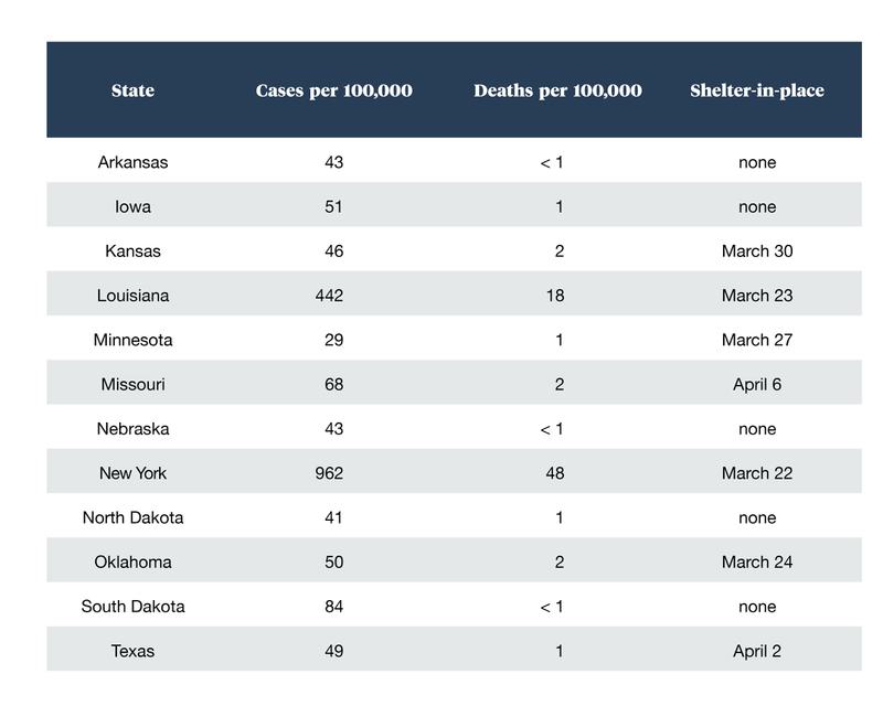 New York is included to show the severity of the outbreak in that state—in the United States, more than a quarter of all cases and more than a third of all deaths have taken place in that one state. Otherwise, all of the states in the Midwest corridor, from North Dakota and Minnesota to Texas and Louisiana, are shown for comparison. (Data on cases and shelter-in-place orders are from the New York Times as of April 13.)